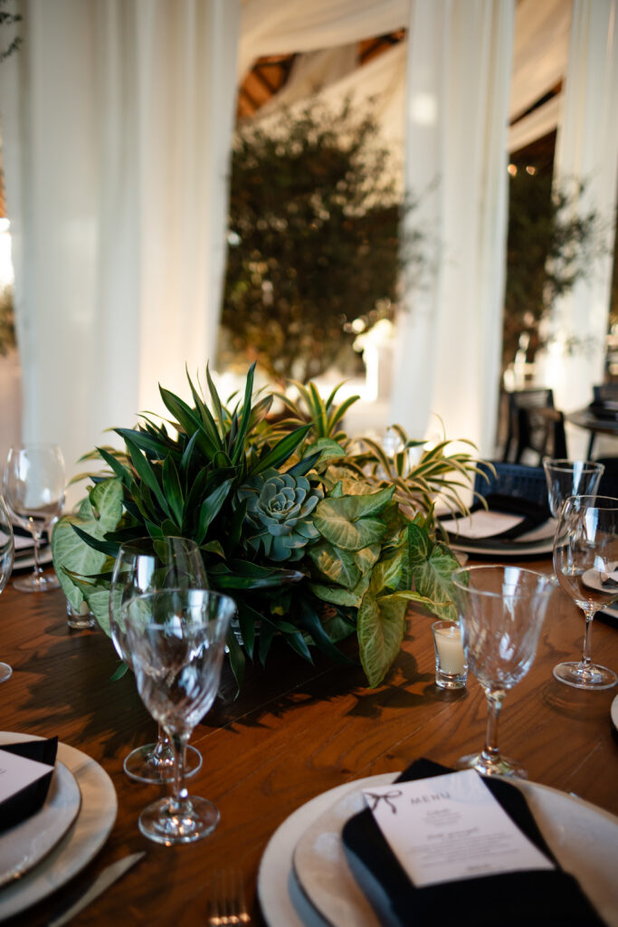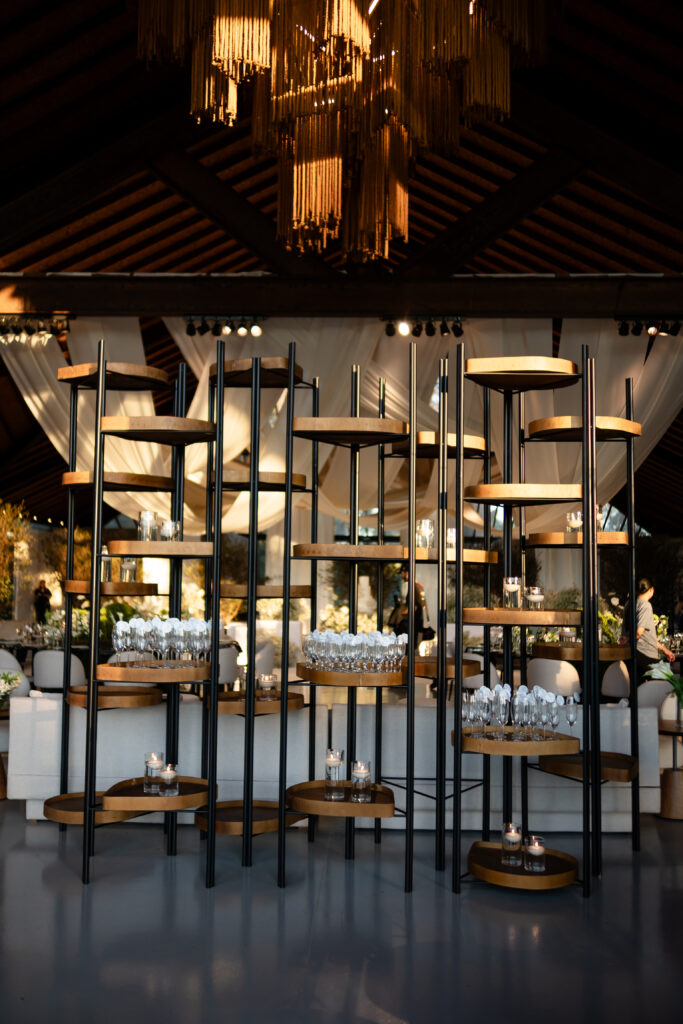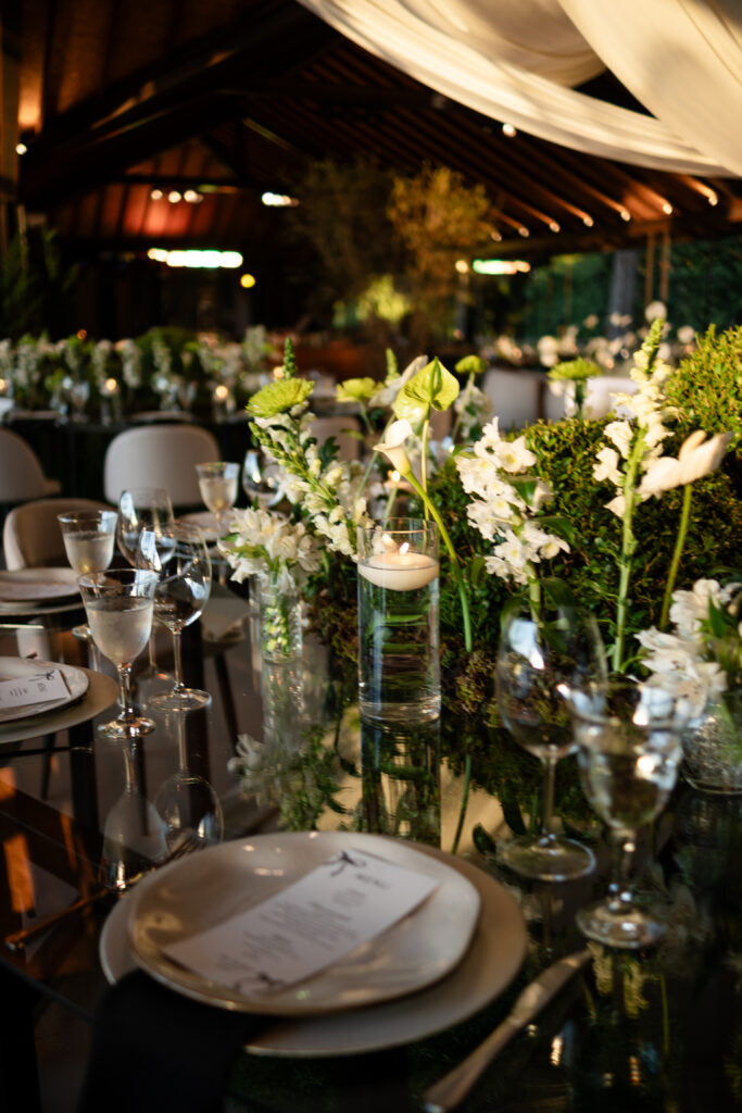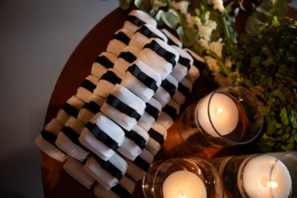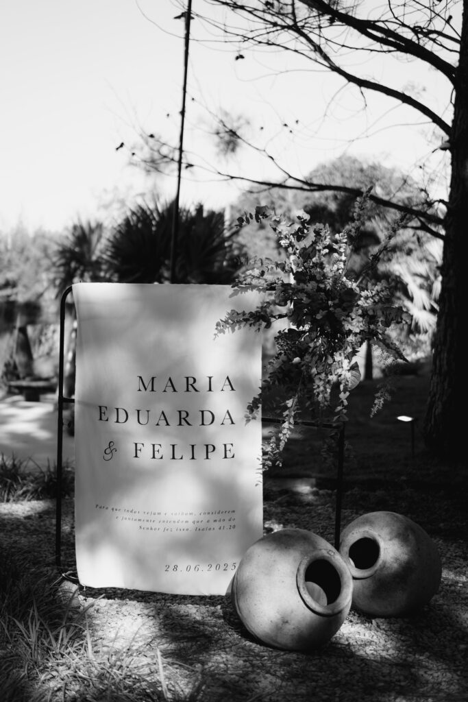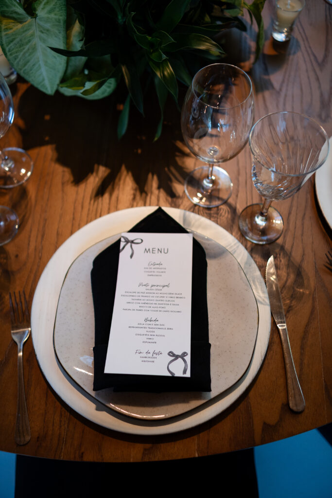 Já a papelaria estava por toda parte, costurando visualmente a cerimônia: lágrimas de alegria, menus, tags nas taças, votos impressos. Criada a muitas mãos, refletia o amor da noiva pelo design, resultando em uma identidade visual coesa e cheia de significado.