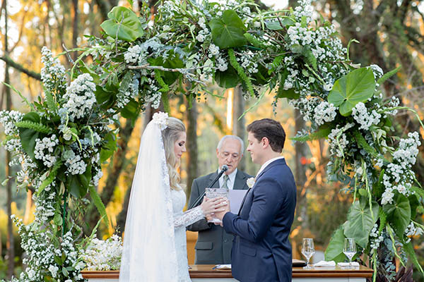 O vestido também foi escolhido partindo do princípio de que a festa devia ter cara de fazenda, eLuciane optou por um modelo rendado, com mangas sem forro. Como o casamento aconteceu em setembro, com temperaturas mais amenas, isso não atrapalhou a noiva na hora de curtir a festa. Para arrematar, ela fez o cabelo meio preso com um arranjo de orquídeas brancas, mesmas flores usadas no bouquet.