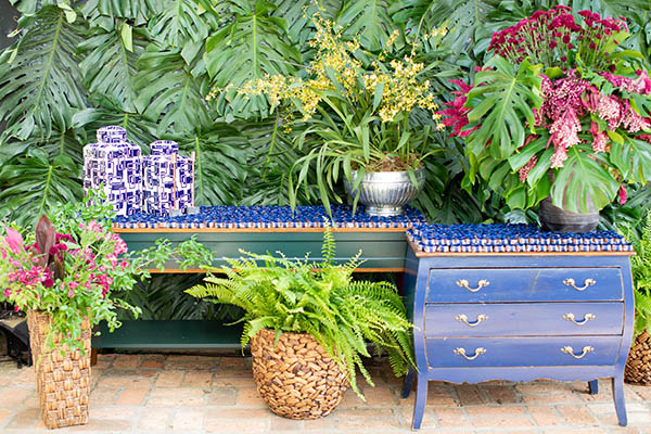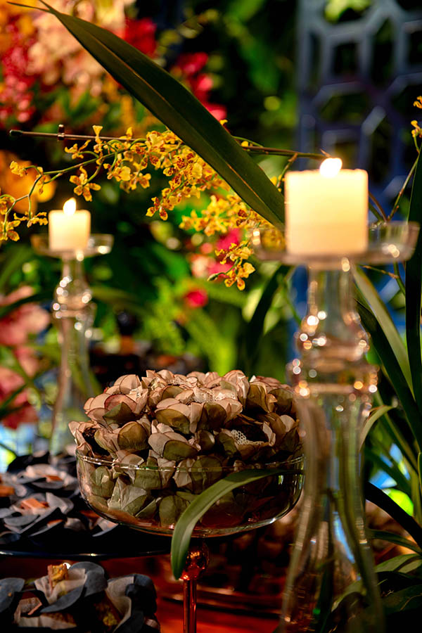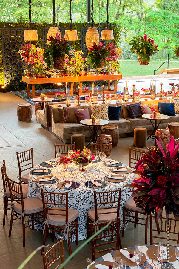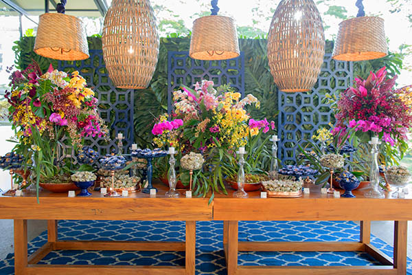 Para a decoração, Luciane queria algo “rústico, mas ao mesmo tempo chic. Fazia questão de cores fortes, como azul marinho e fúcsia, que são minhas favoritas“, conforme conta. Beta Luca seguiu a dica da noiva e usou toalhas azuis e brancas, com arranjos marsala e rosa. Nos aéreos, predominaram folhagens em tons de verde e pink. O mobiliário, predominantemente de madeira, era Center Festas, assim como os tapetes, dois itens fundamentais para garantir o aconchego da decoração. Os longos sofás receberam os convidados como se fosse na casa dos noivos, clima que era uma das prioridades da noiva.
