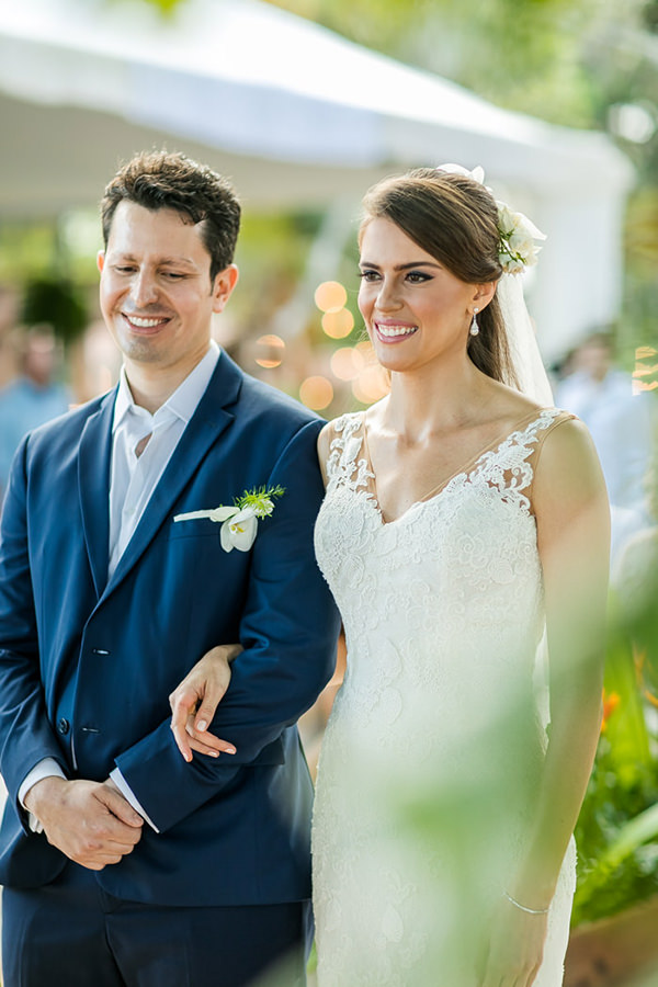 Ana Elisa queria um vestido de noiva que tivesse cara de praia. Ela escolheu um modelo enxuto, de Fabíola Cardoso, com aplicações de renda floral. Para complementar o look, Véu curto, penteado meio-preso com flores naturais e bouquet de orquídeas.