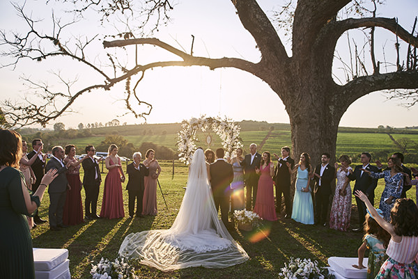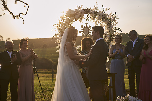O rosa, de fato, só apareceu na festa, deixando o branco imperar na cerimônia, que ganhou a companhia de um lindo pôr-do-sol. Na árvore centenária do espaço, um arco de flores brancas marcou o altar, enquanto vasos baixos decoraram o caminho da noiva.