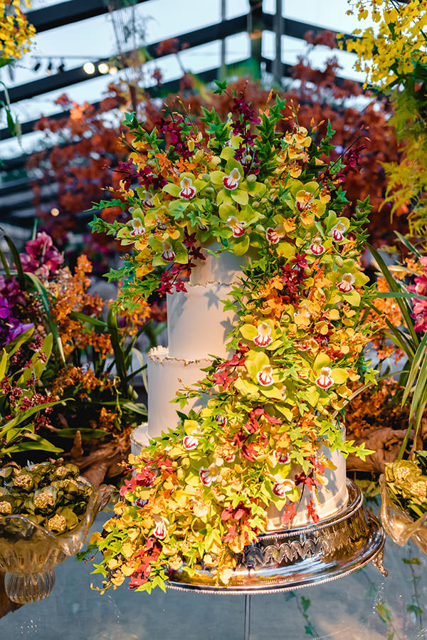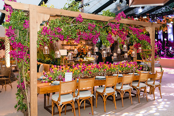 mesa de doces foi o destaque do jardim tropical. A peça de pés de madeira e tampo de vidro ganhou uma profusão de flores em diferentes cores e espécies.