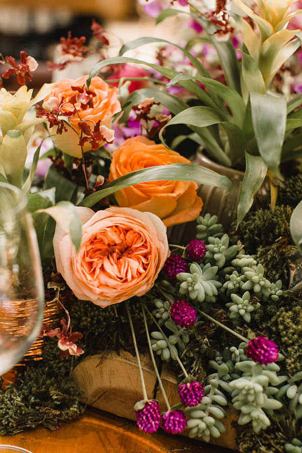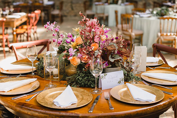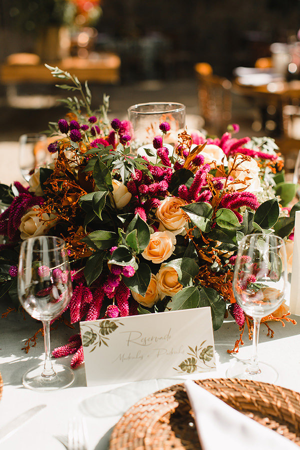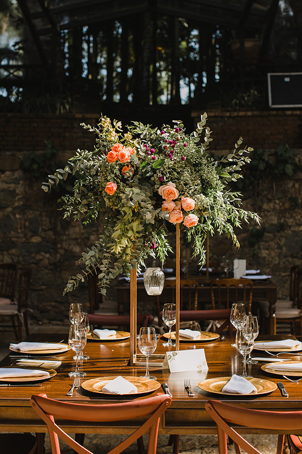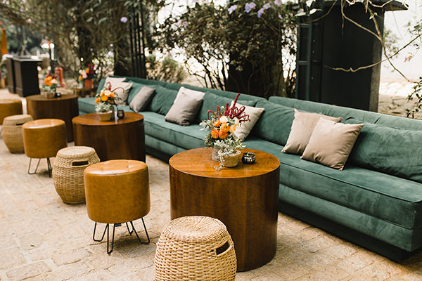 Tons vibrantes de laranja, rosa, roxo e verde predominaram nos arranjos florais da festa, compostos de rosas, garden roses, alpínias, orquídeas e suculentas. Para acomodar os convidados, a Nina Vintage escolheu móveis clássicos de madeira para a área das mesas, e peças mais contemporâneas para os lounges, todos da Center Festas.