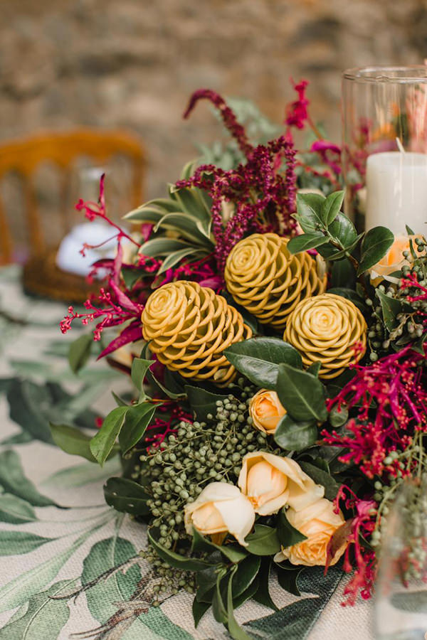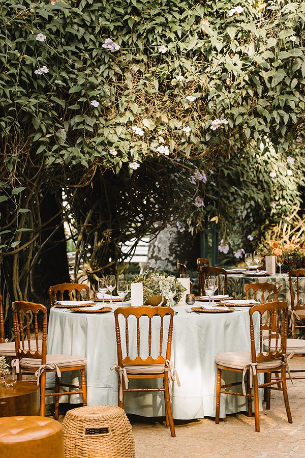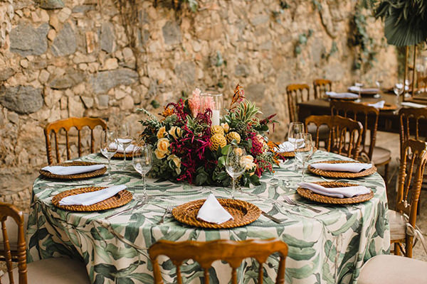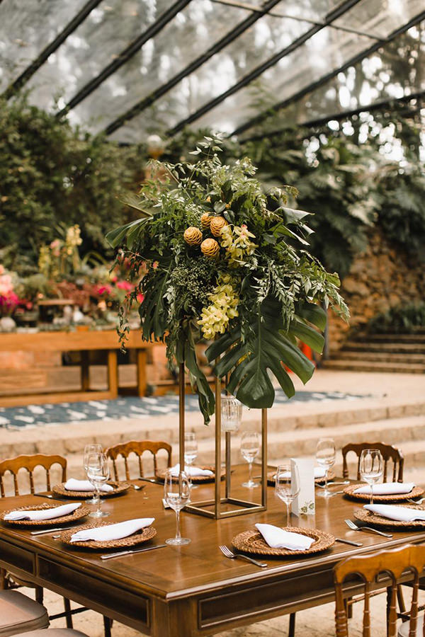Além dos arranjos, as folhagens também estamparam algumas das toalhas da Center Festas, de quem também eram as louças e os sousplats de fibra natural.