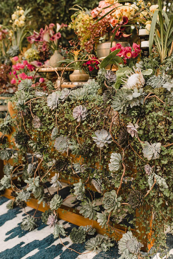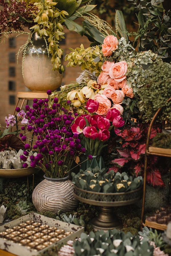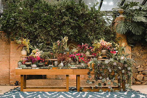 A mesa de doces foi decorada com muitos arranjos e, principalmente, folhagens e suculentas. Os vasos de metal deram um toque vintage à composição.