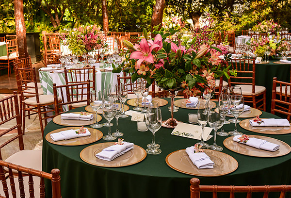 Já para a festa, os arranjos florais ganharam vasos metalizados em tons de cobre e, nas mesas, sousplats em tons variados.