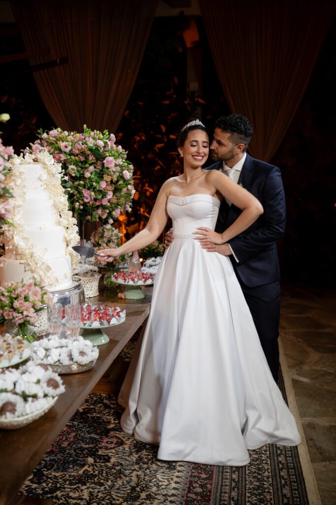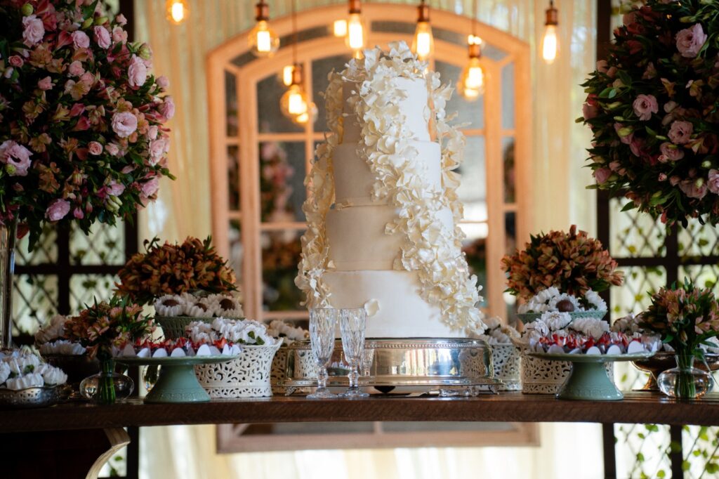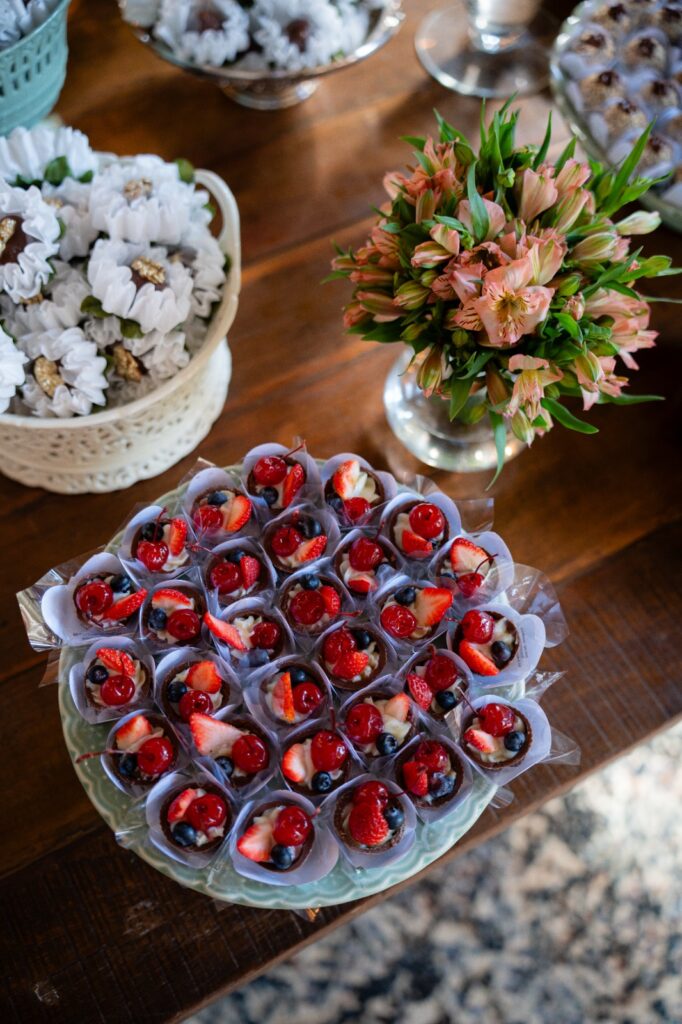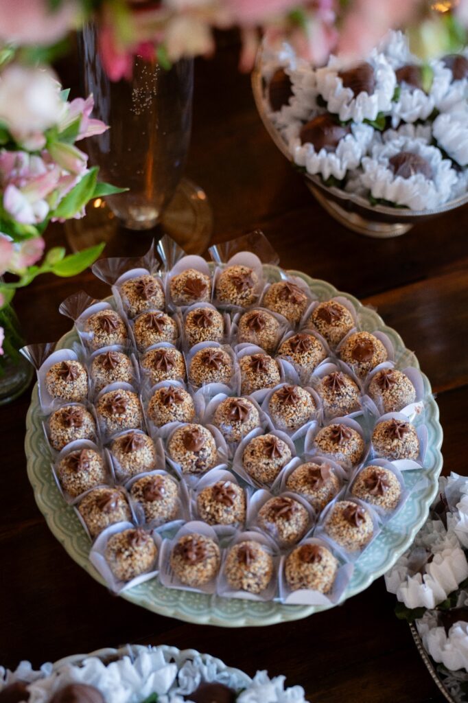 O buffet serviu um jantar saboroso com destaques como o filé ao molho madeira com arroz piamontese e o risone de bacalhau. Para adoçar, a escolha foi certeira: doces finos, brigadeiros especiais e um bolo de abacaxi com coco e baba de moça — o sabor favorito da noiva.