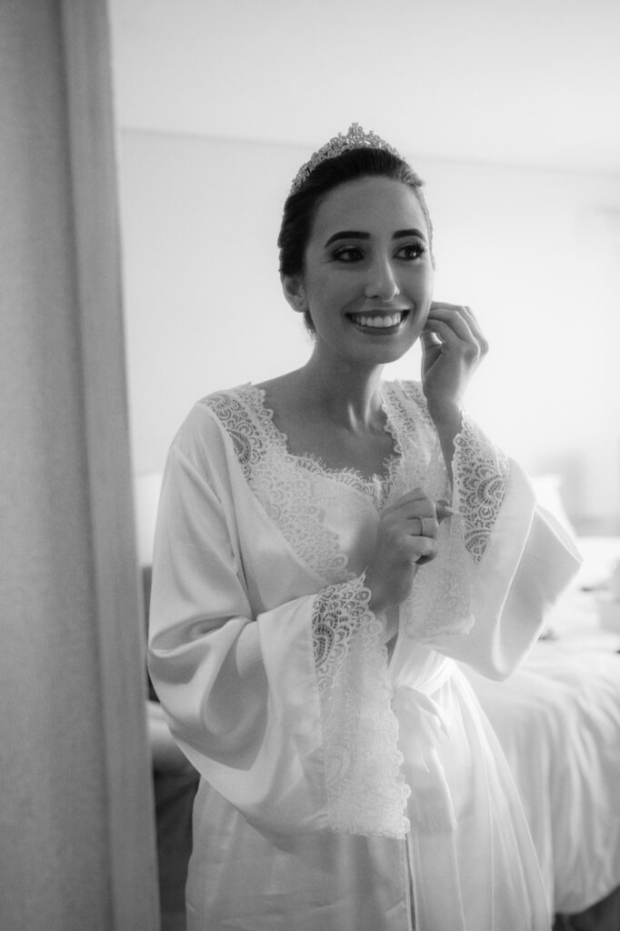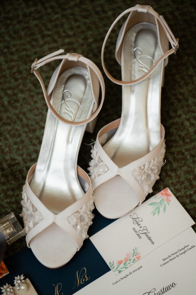 No look da noiva, cada detalhe carregava história e significado. Ela escolheu um vestido minimalista com tecido encorpado e linhas limpas, que traduzisse exatamente sua personalidade. Para os pés, um destaque especial: os sapatos feitos sob medida por Marianna Machado, com rendas selecionadas pela própria noiva. Um toque de delicadeza que completou o visual com exclusividade e poesia.