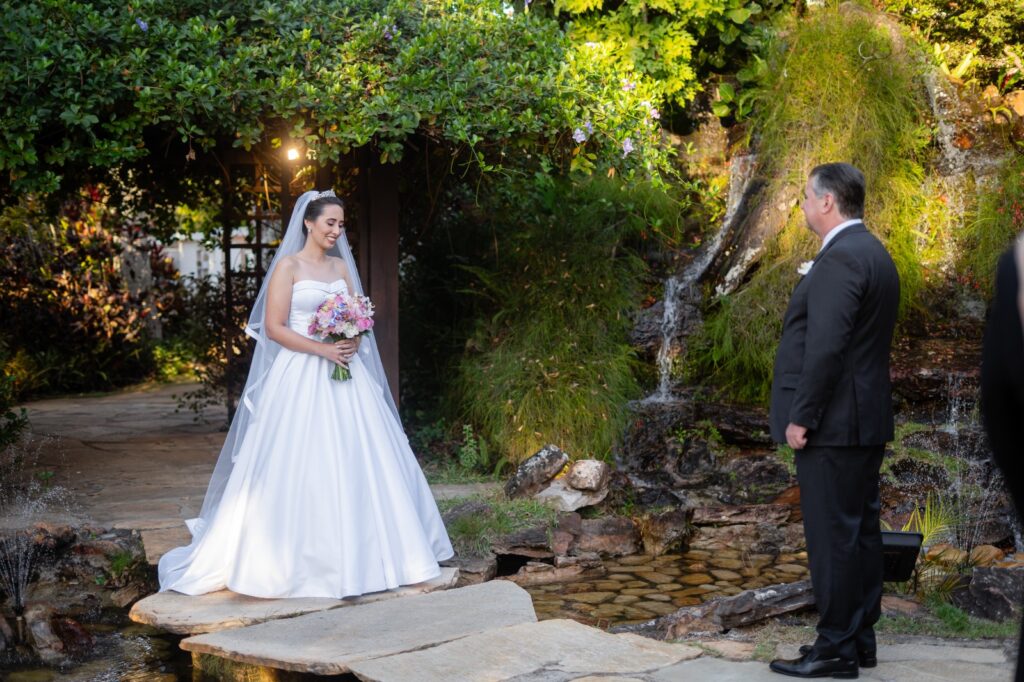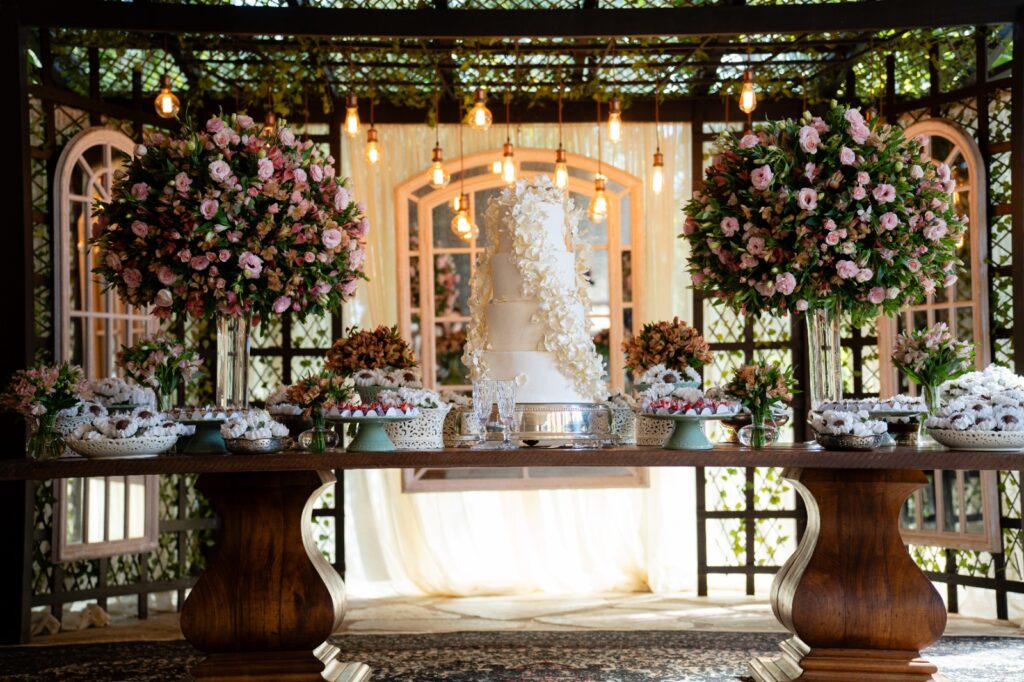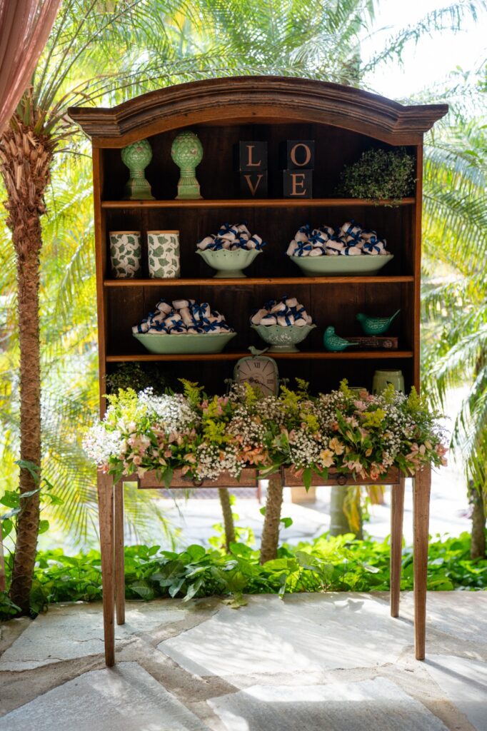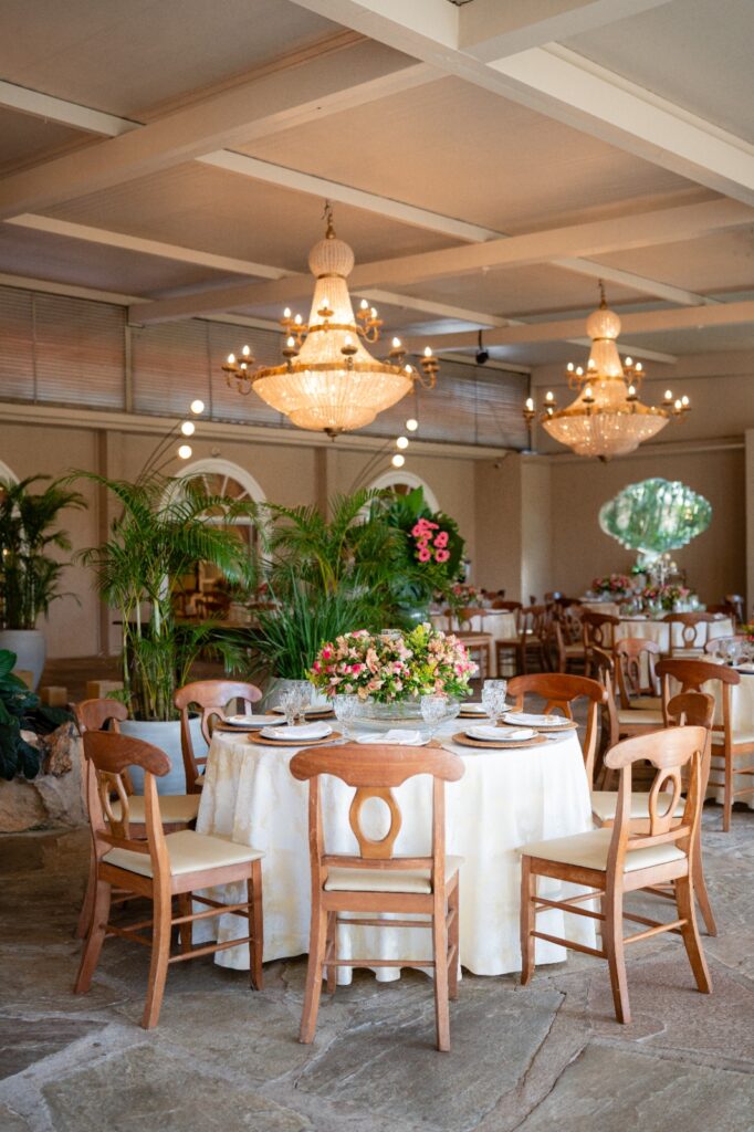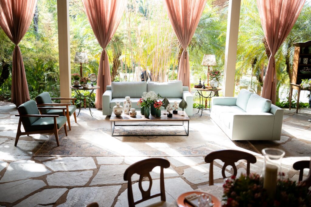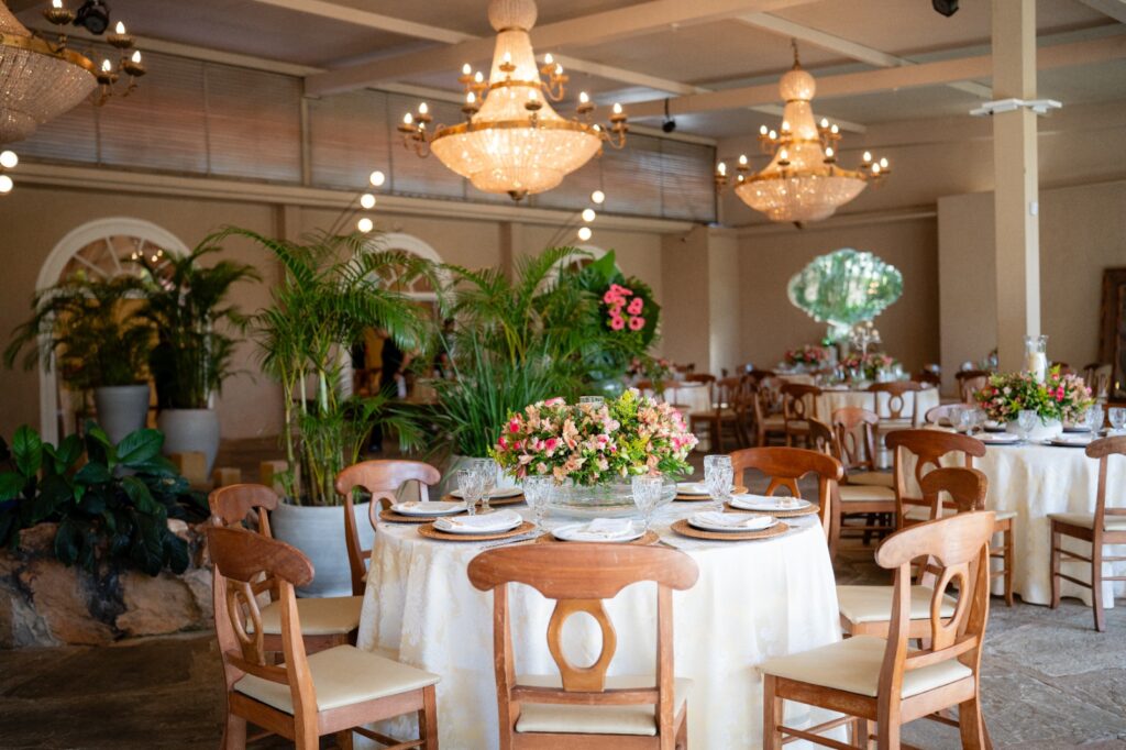 A escolha do cenário foi imediata, ao se encaixar no espaço sonhado pelos noivos, com sua luz suave e vegetação envolvente, foi o palco perfeito. A decoração rústica e elegante, com o acervo de móveis do próprio espaço, completou o ambiente com naturalidade. Eles queriam uma festa que refletisse quem são, e encontraram esse equilíbrio entre natureza e beleza, além de um salão que por si só já é um espetáculo.