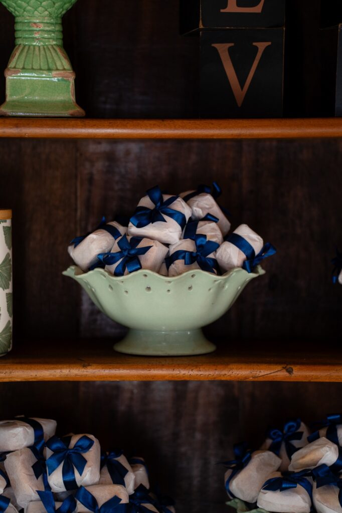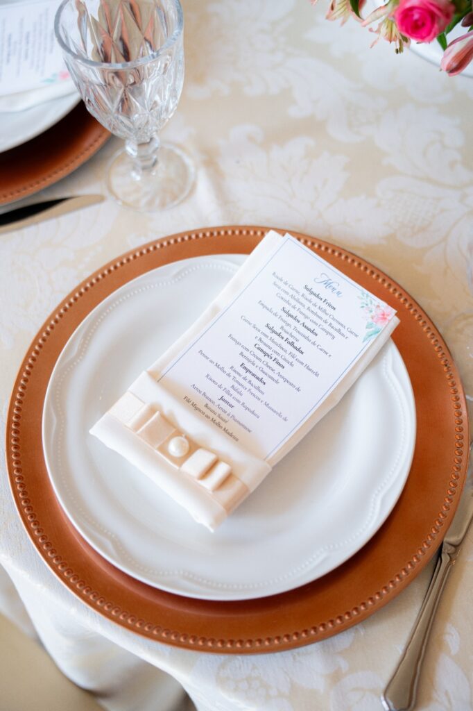 Luísa, amante de papéis, arte e identidade visual, fez questão de criar toda a papelaria do casamento. Envelopes, convites, lágrimas de alegria, menus, caixas de padrinhos — cada item levou meses de dedicação e amor. E até os cadernos de votos e o porta-alianças foram bordados por ela. Memórias de fio e tinta, transformadas em relíquias.