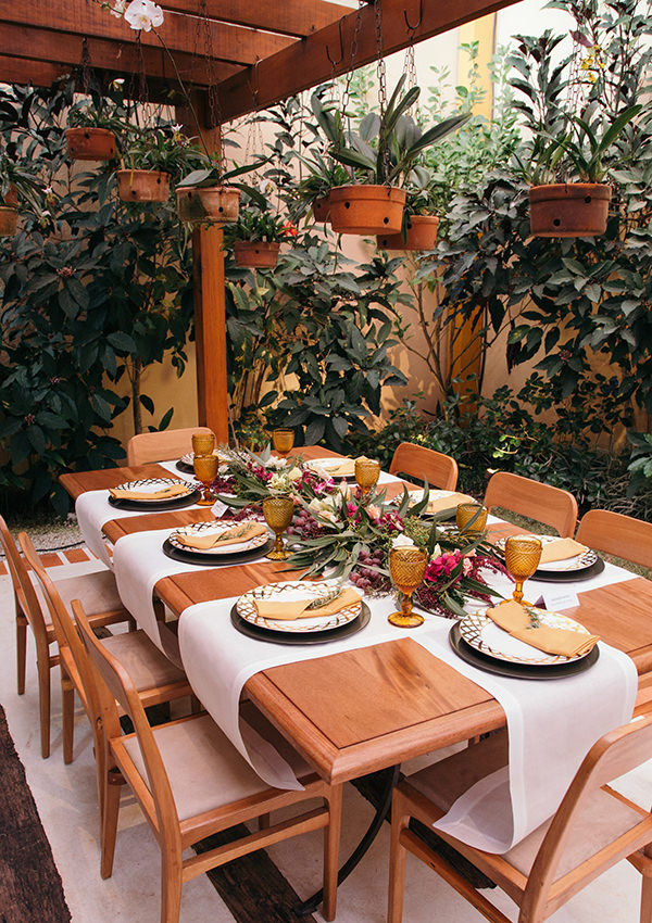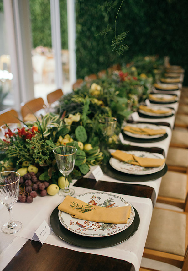 No jardim, longas mesas comunitárias receberam os amigos, em um gosto almoço. Pra garantir que a conversa fluísse, centros de mesas de arranjos baixos. Para acompanhar o mix de flores e ainda perfumar as mesas, limões, uvas e outras frutascompuseram a produção.