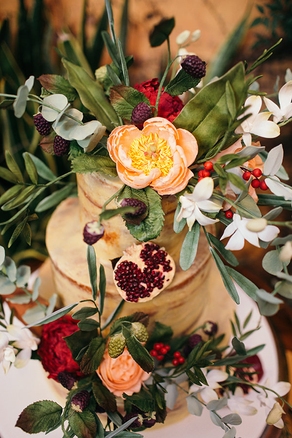 O mix de folhagens na mesa de doces chama a atenção, principalmente porque são espécies que pouco usadas em decoração de casamento, mas que têm um colorido e textura lindos. São folhas comuns em jardins de casa mesmo, deixando o projeto totalmente integrado com o local.