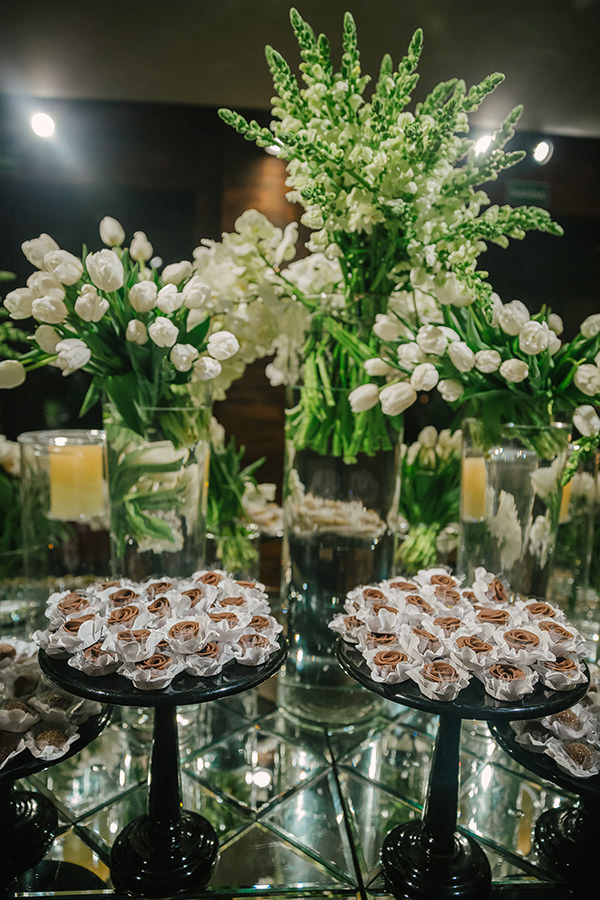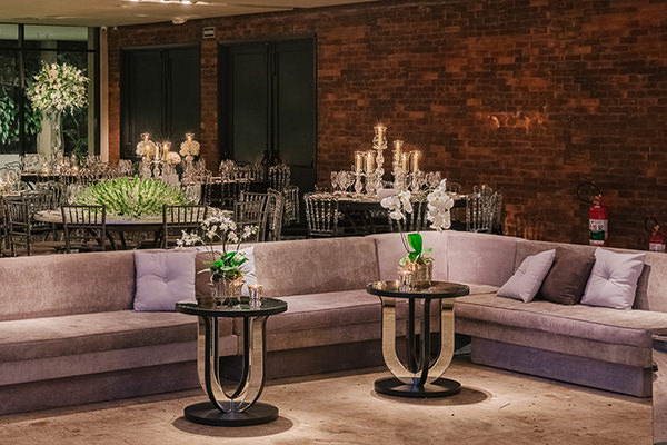Na festa, Roberta Fasano deu toques contemporâneos à decoração do casamento com mesas sem toalhas e arranjos de diferentes formatos. Dentre as espécies principais: orquídeas e boca de leão.