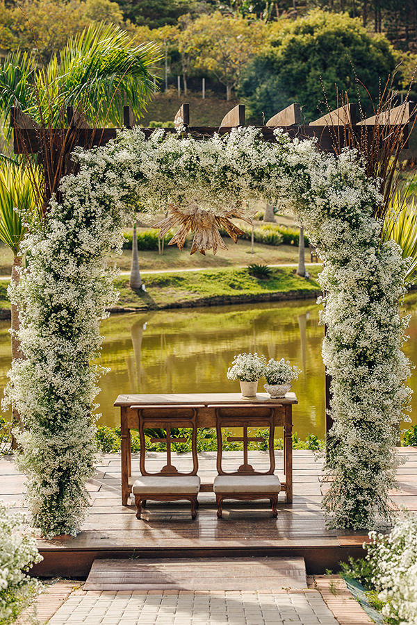Na cerimônia, Karina deixou que o verde brilhasse, apensas salpicando o branco dos mosquitinhos pelo contorno da nave e altar.
