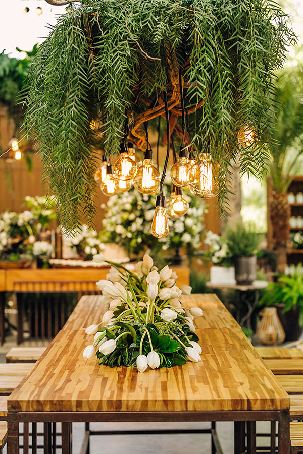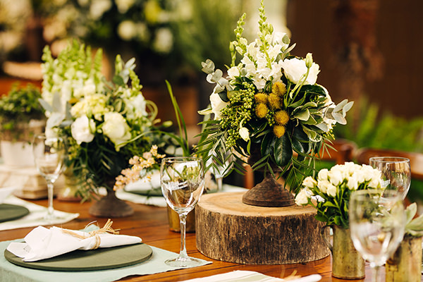 Nos centros de mesa, guirlandas com rosa, eucaplito, hortênsia, entre outras espécies, e arranjos baixos dispostos em troncos de madeira e direto na mesa, o que deu movimento à decoração.