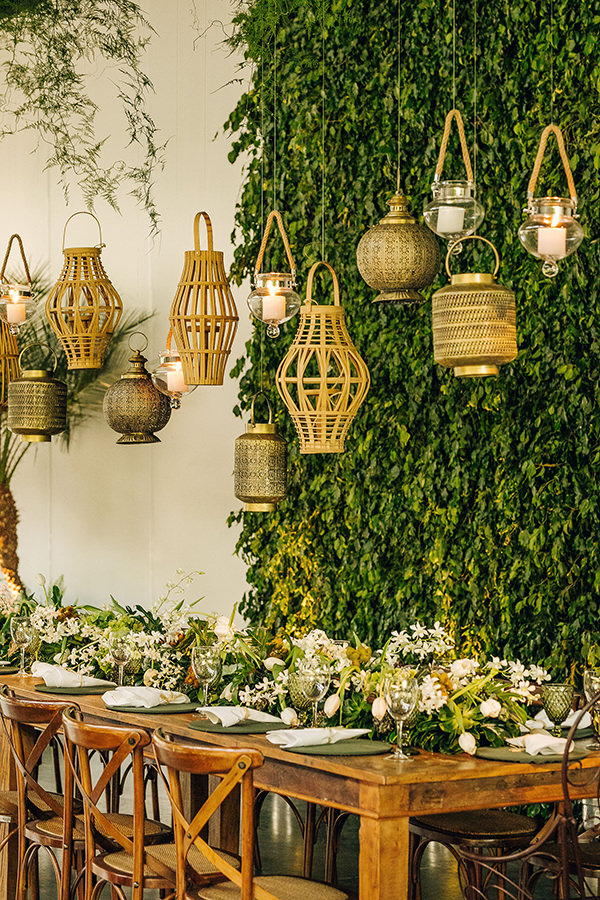 Na mesa da família, o aéreo de lanternas e a parede de verdes chamam a atenção.