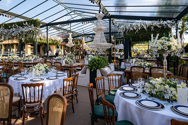 Veridiana e Mará Salomão, que comandam a Estação Primavera, foram as responsáveis por esta linda e clássica decoração de casamento no campo. As decoradoras partiram de dois pontos: projeto floral em verde e branco, e toalhas de richelieu para as mesas. O mobiliário de madeira deu o toque campestre para a celebração.