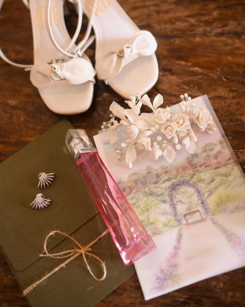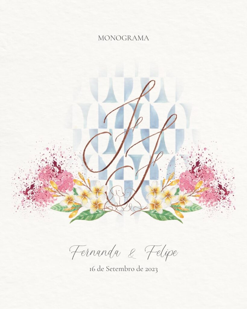A partir dessa arte inicial, o estúdio desenvolve uma identidade visual completa para o casamento, aplicada em convites, papelaria, menus, cartões, monogramas e diversos detalhes gráficos que compõem a estética do evento. Dessa forma, todos os elementos do casamento seguem uma linguagem visual harmônica e autoral, criando uma experiência estética elegante e memorável.