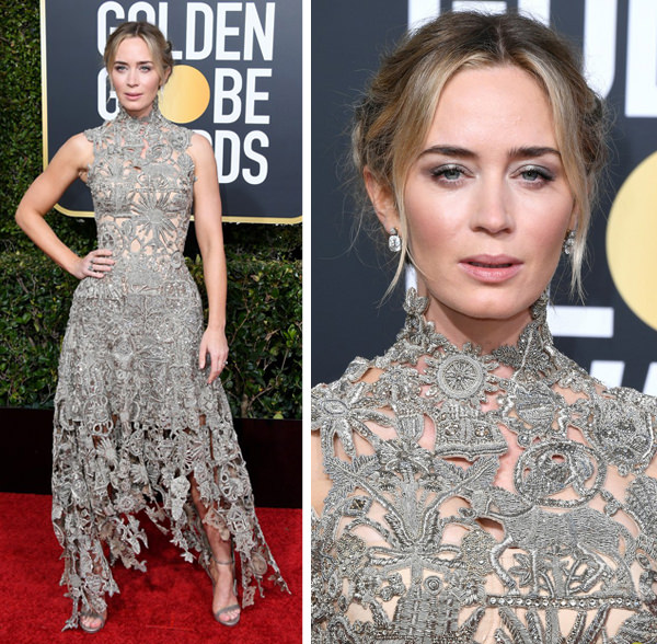 Emily Blunt fugiu do óbvio, com vestido Alexander McQueen com saia assimétrica: