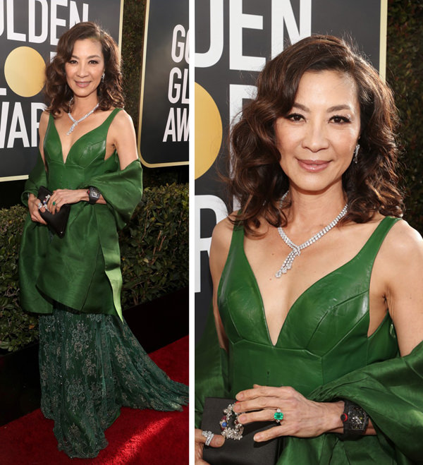 Por conta da mistura de tecidos, o vestido de Michelle Yeoh também fugiu do óbvio! Para arrematar o look, a atriz usou o anel de esmeralda que se tornou a marca registrada de Eleanor Young, sua personagem no filme Podres de ricos: