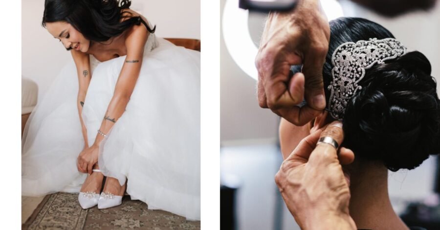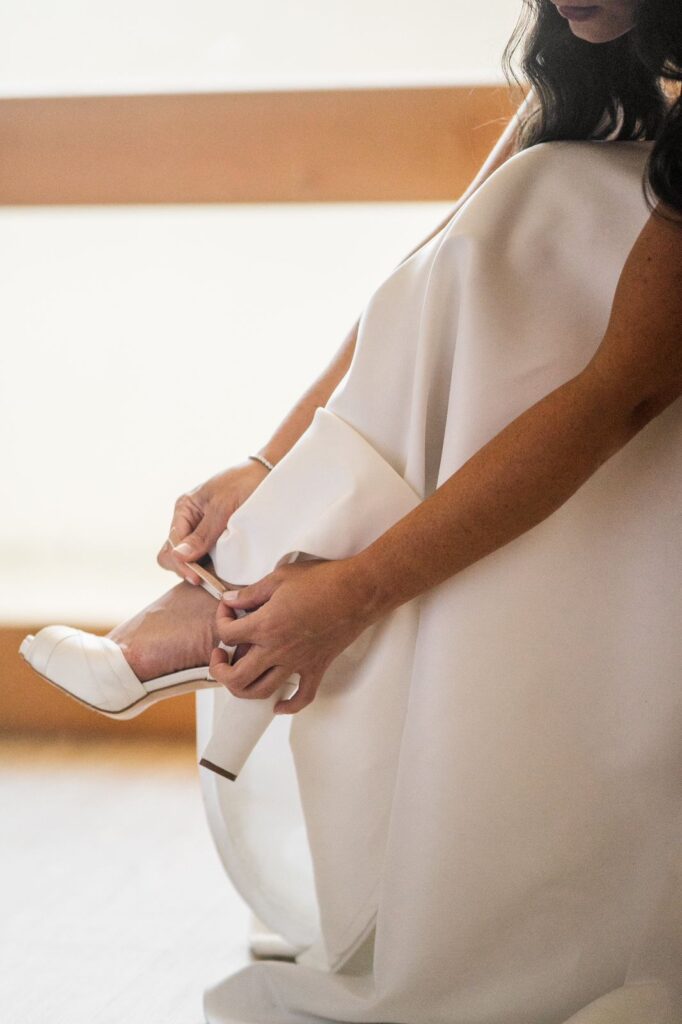 Já o sapato, muitas vezes subestimado, também entra nessa equação estética. Para Marianna Machado, especialista em confecção de sapatos de noivas e de festa, a harmonia começa na observação do vestido. “É importante que o sapato complemente o vestido sem tirar o devido destaque que ele merece.” Tecidos, cores e acabamento precisam conversar entre si. Um vestido branco com um sapato de cor contrastante pode alterar completamente a leitura visual quando aparece nas fotos. Da mesma forma, um vestido liso e minimalista combinado com um sapato repleto de aplicações cria um novo ponto de atenção. Quando o objetivo é manter o vestido em evidência, essas decisões precisam ser pensadas com precisão.