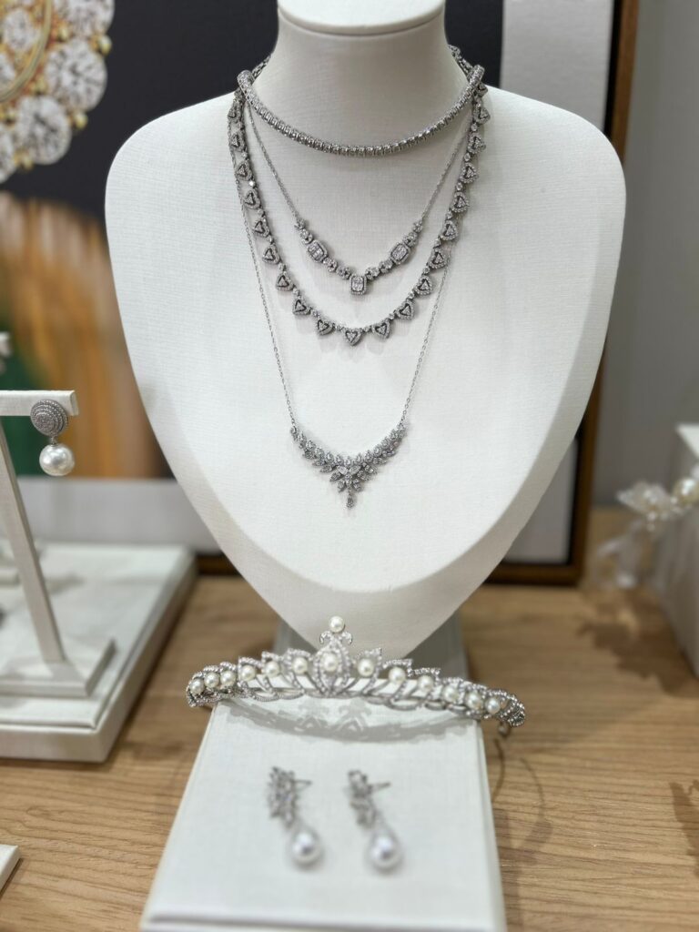 A Zairaf amplia essa percepção ao destacar o papel do equilíbrio. “Quando o vestido é mais elaborado, acessórios delicados e bem proporcionados trazem equilíbrio. Já em produções minimalistas, uma joia com design marcante pode assumir o protagonismo com elegância.” A escolha deixa de ser aleatória e passa a ser estratégica, já que cada peça precisa ter objetivo, significado e, principalmente, diálogo com o traje. A joia está ali para sustentar a imagem da noiva.